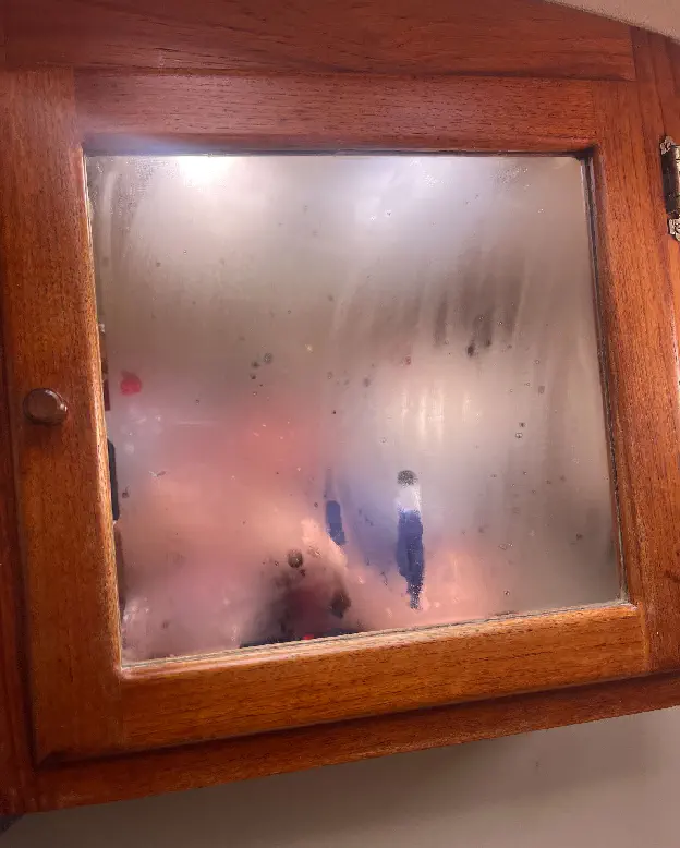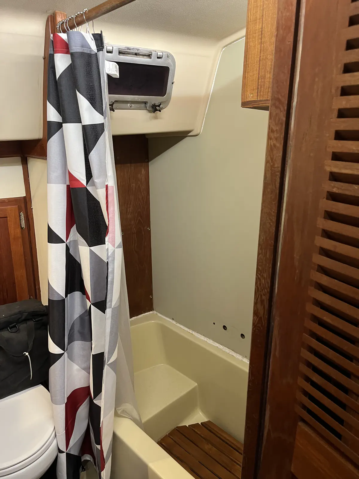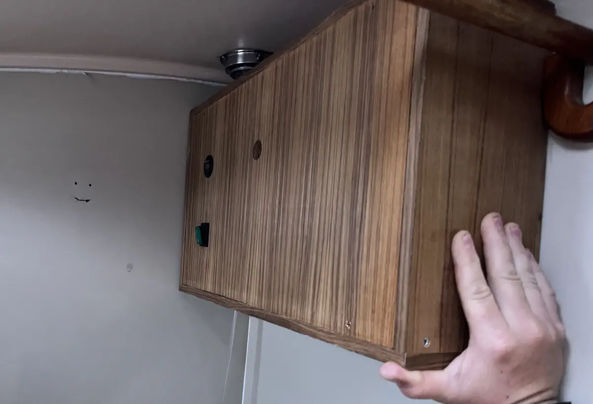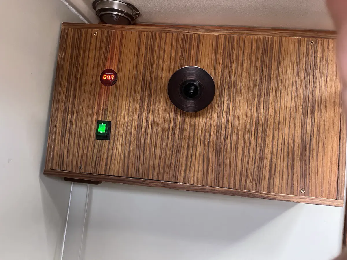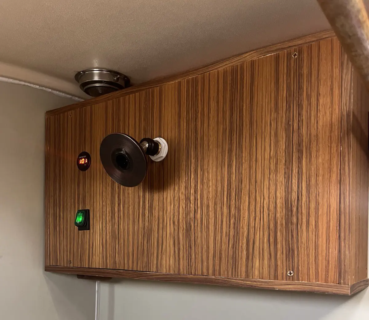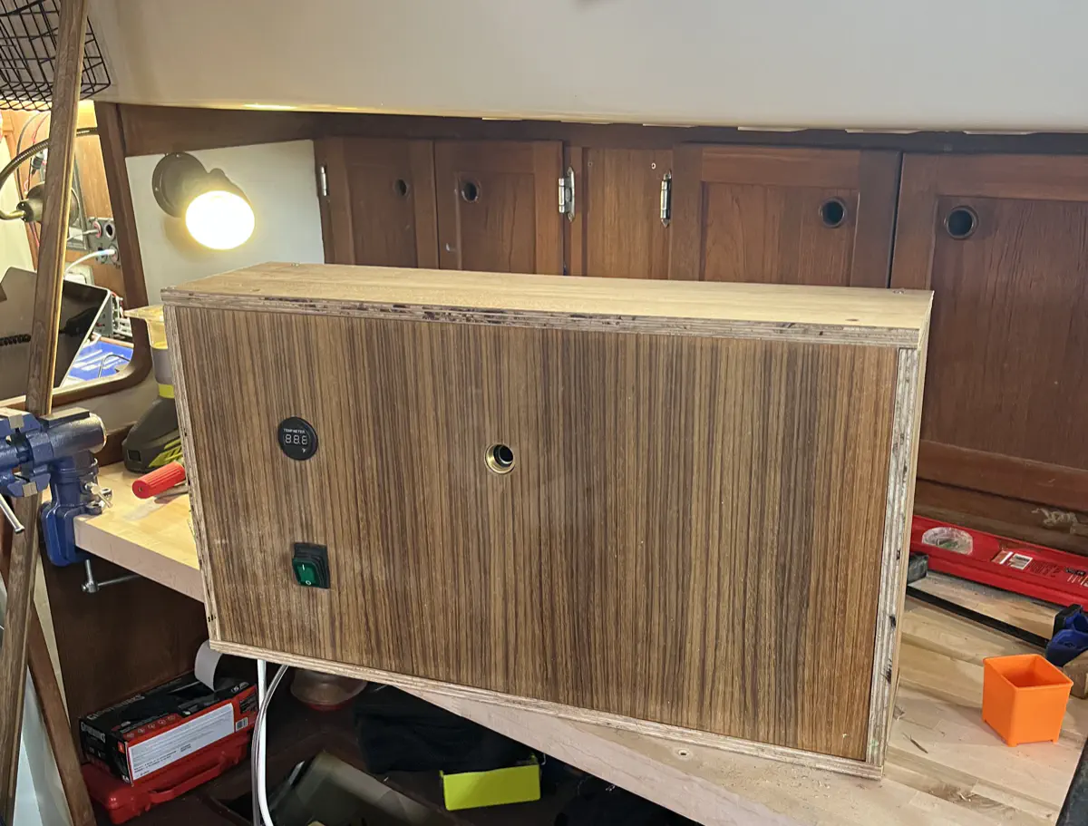 Now that the unit proved to work in practice, it was time to polish her up a bit. I went with teak ply and edge banding because what other wood are you going to use in the shower of a shippy old boat? I also elected for bronze screws everywhere, to try and keep things with the time period. For the showerhead I was forced to use “oiled bronze” which I kinda hate; I will leave it to future me to replace the head with an antique bronze head if I can find one. The finished box cuts, ready for the banding.Banded and test-fitted, so far so good!The whole box sits on the inner bulkhead of the shower, with water supply and power both coming up from behind the v-birth door and through the back of the unit. That means no exposed pipes, wires, and no mechanical clutter in my shower. There is still the air hose line that runs down to the foot switch, which I will eventually mount to the corner bead in copper pipe to give it a more polished look. Now I just need to clean up the holes left by the original hardware, re-caulk, and Defiant will have a proper shower. No mess, no wires or pipes, just a little cosmetics and we're in business.The finished product, teak-oiled and in service!I have an oiled bronze cap for the plastic fitting, but I am holding out for something a little more antique.