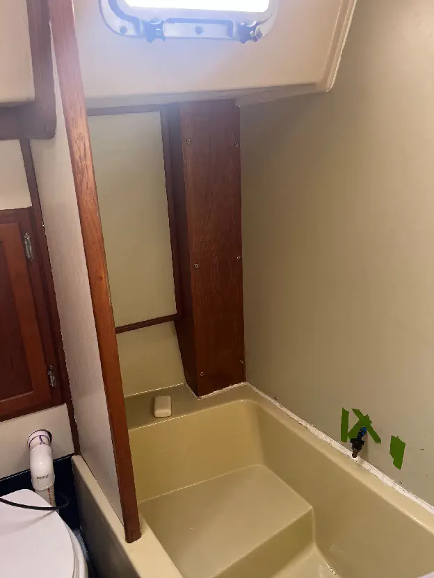 Defiant has a full tub/shower in the head (really unheard of in a 36ft sailboat) and was set up to have a hot water tank, mixer, and handheld shower that was basically the same as being on land. The previous owners had removed the water heater and all the plumbing to use the shower and additional space for storage - so why not just reverse the process and restore the original boatbuilder’s intent? Here’s the footprint: