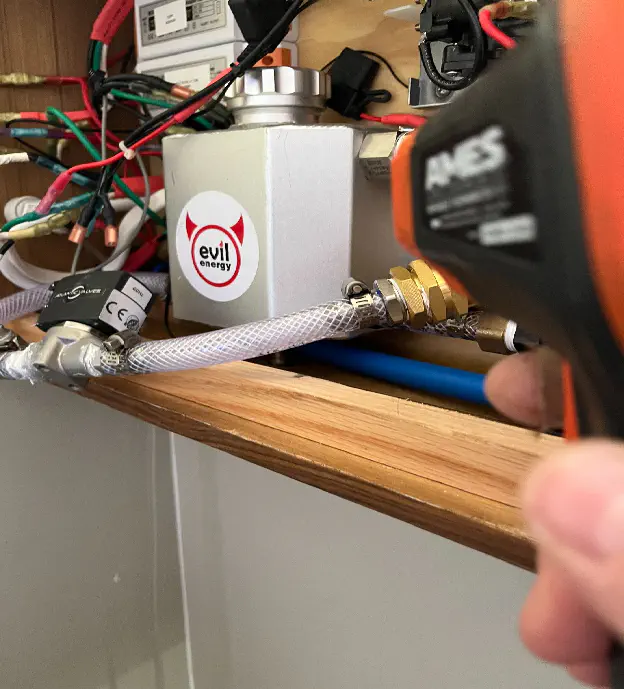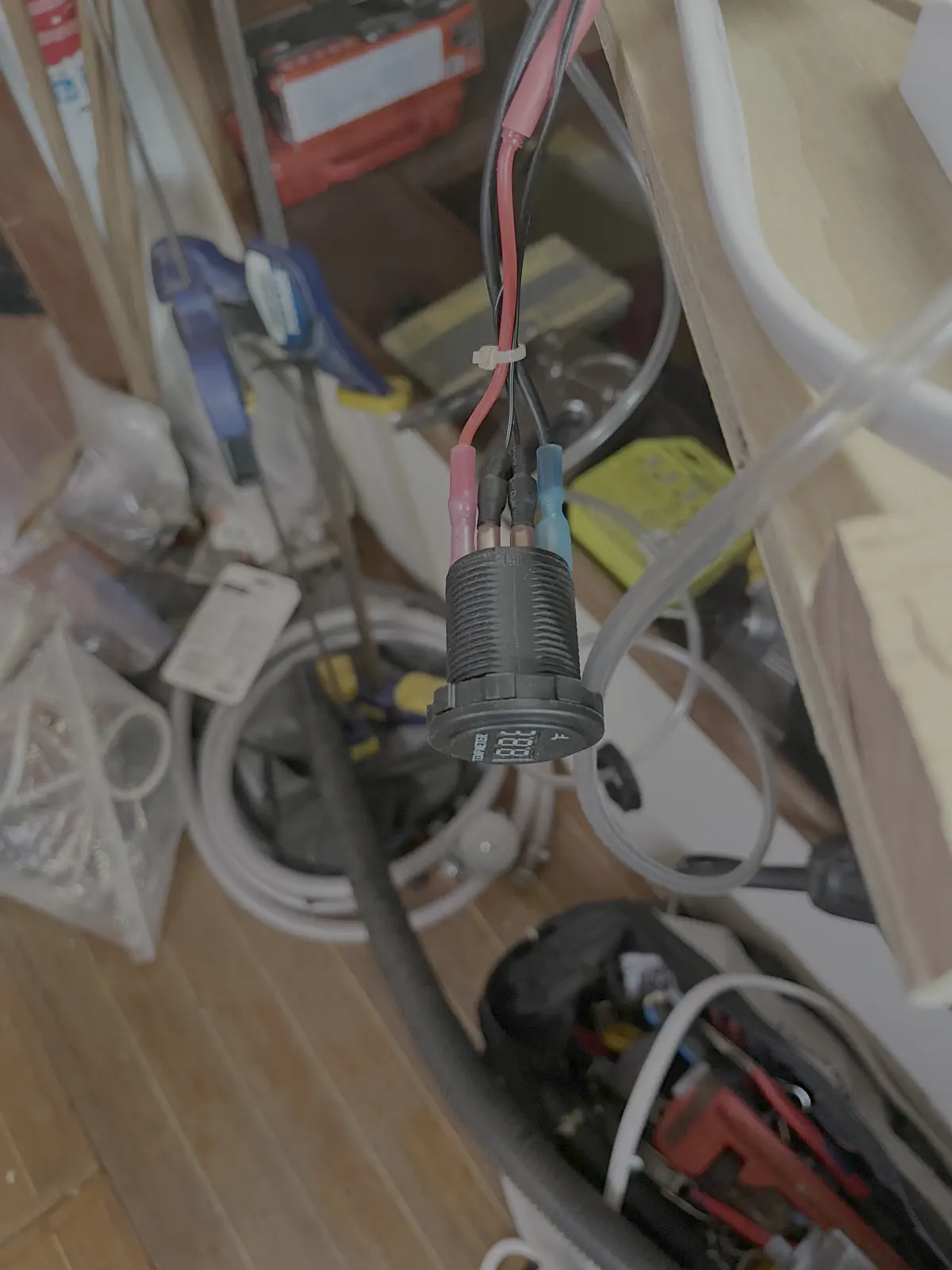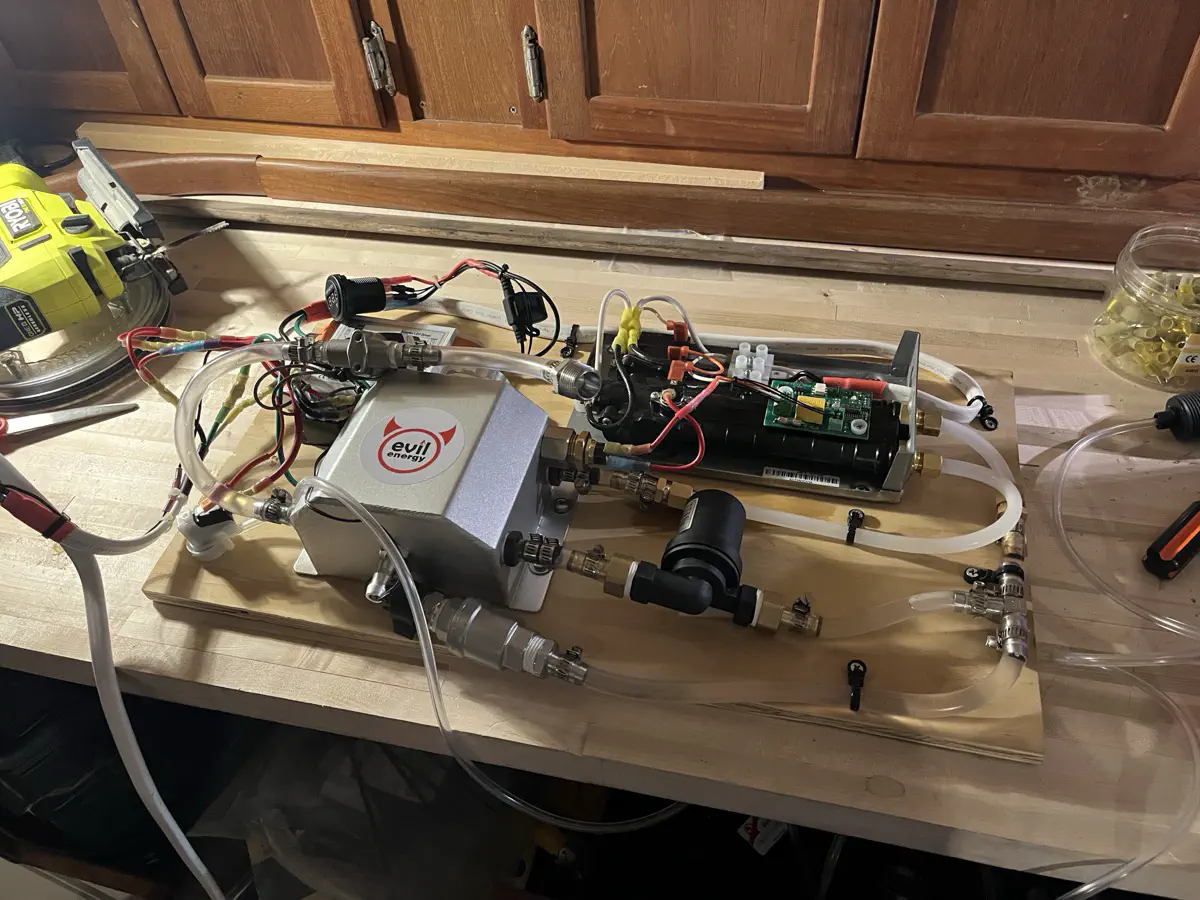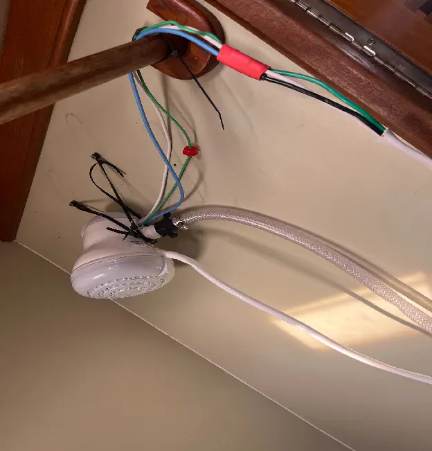 Now it was time for a mock-up rig to conduct experiment: What could possibly go wrong?Floor switch, left dangling for now.Unfortunately this experiment was largely unsuccessful. The power draw from the little unit spiked to more than double the rated 1300W, immediately tripping not only my panel main and pedestal breaker, but the entire dock went dark on my side of the marina π€¦. And still the water was ice cold. The bursts of water passing through the heat element did not give the unit time to reach temperature; even if I could get the unit’s power draw under control, I was going to have to dump precious gallons of cold water down the sink every time I wanted a little warm burst, defeating the purpose.