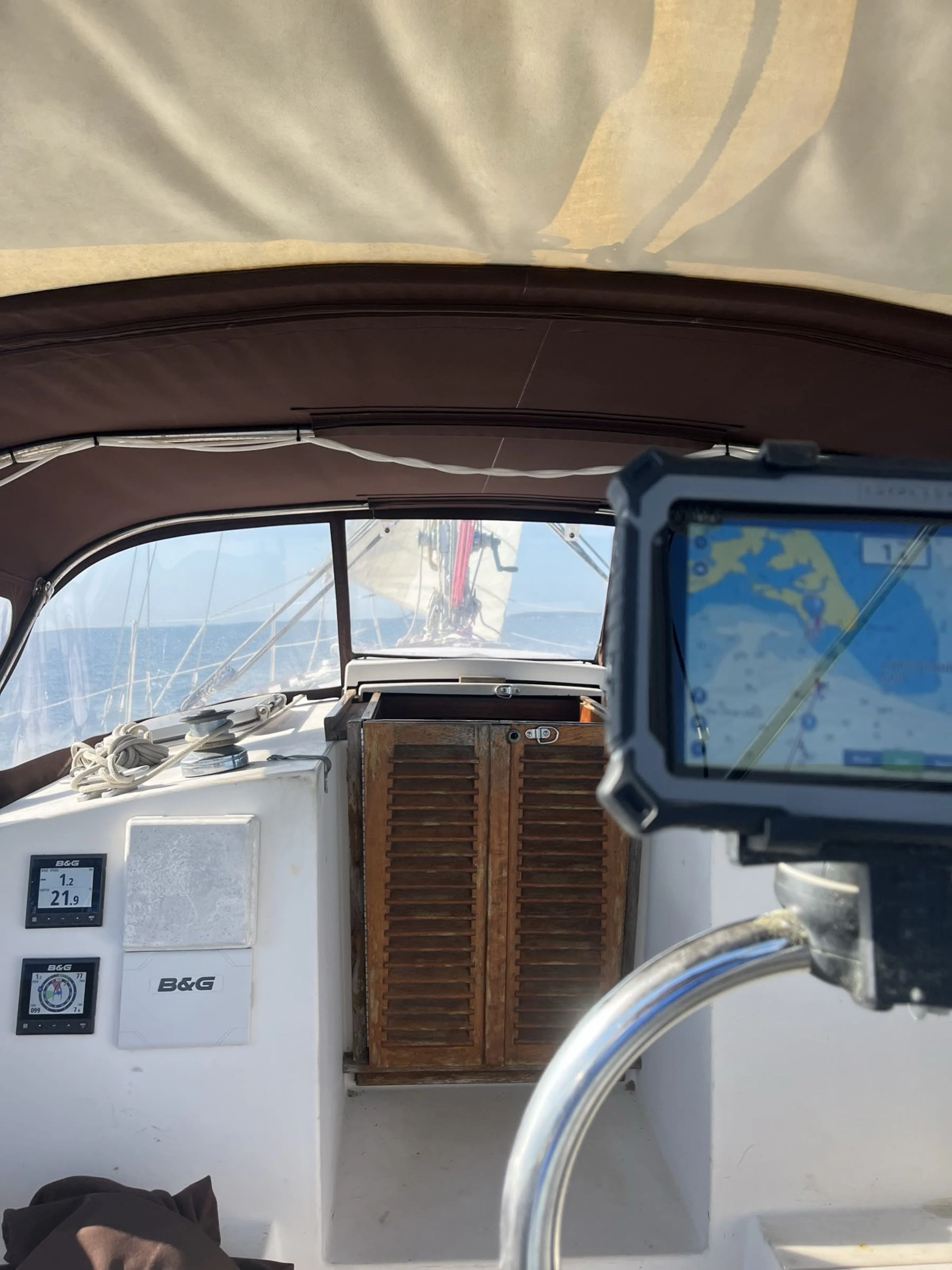 The companionway is the best way to stay under cover in the rain without going below